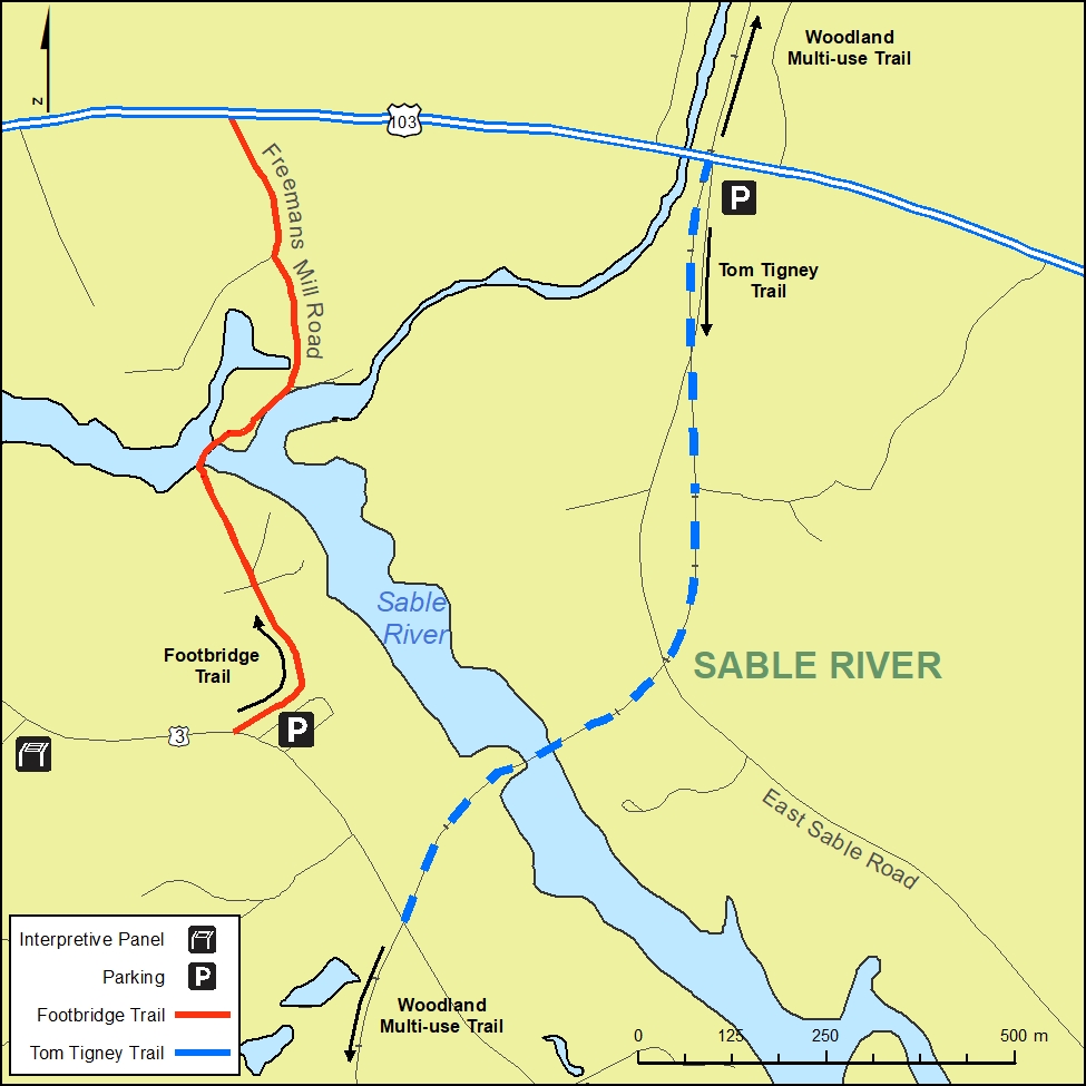 NOTE: The Sable River Footbridge is temporariliy closed due to unsafe bridge conditions. It is anticipated that repairs will be carried out fall of 2019 and the bridge wil re-open accordingly.
