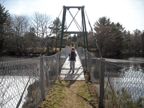 The Footbridge Trail (approx. 0.8 km) head is a small parking area located in the Sable River Volunteer Fire Department’s yard. From the trail head walkers follow the signs that lead them to the swinging bridge, across it, and along the Freeman’s Mill Road where it ends at Hwy 103. It is neat to experience the swinging movement under your feet as you cross the bridge. A major portion of the Foot Bridge trail has been used by the Sable River community for over a hundred years and is known locally as the “footpath”. Motorized use is not allowed along the Foot Bridge trail.