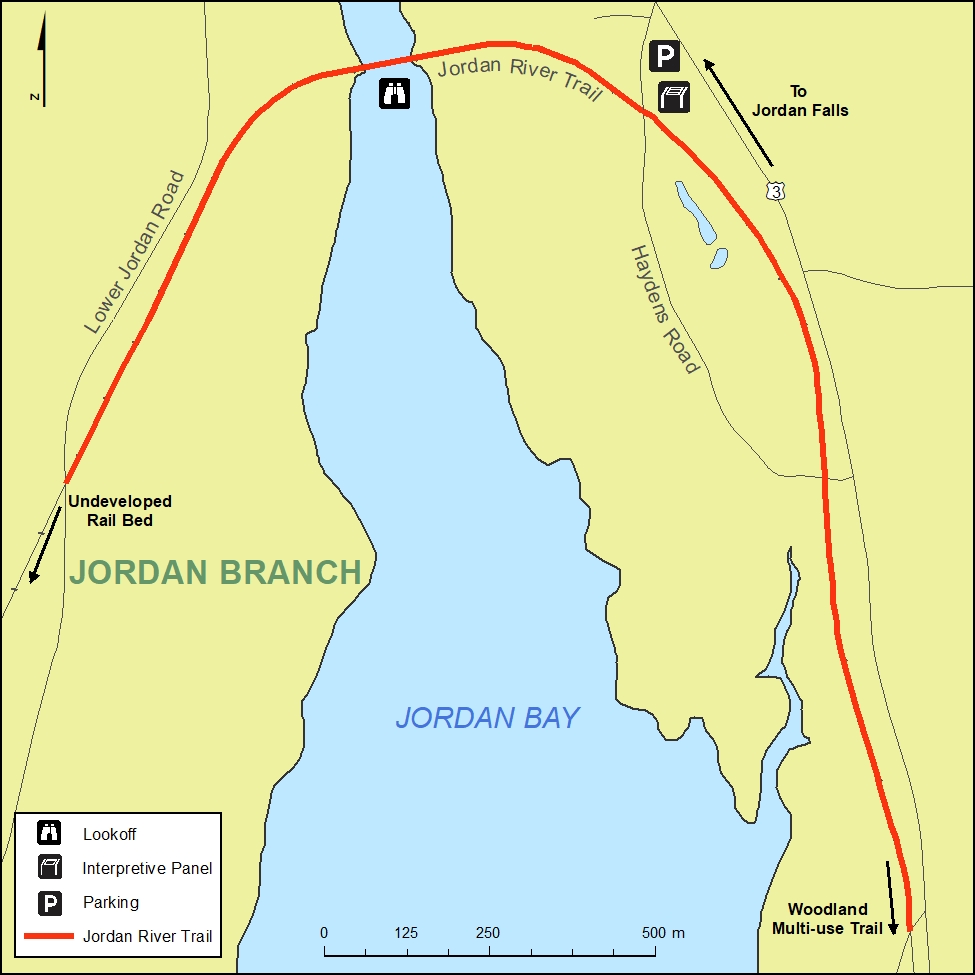 The Jordan River Trail (approx. 2.6 km) is located in the Jordan Falls community. To get to the trail head from the 103 hwy take exit #24 along #3 hwy from Jordan Falls to Lockeport. Turn right onto Hayden’s Road. The Trail head is located in a small parking area beside Hayden’s Road. From the trail head you can walk along the trail to the left to end near Camp Jordan or to the right to go across the Jordan River. The former CN bridge has a fenced board walk along it, you walk beside salt water marshes to the trail end where it meets the Lower Jordan Road. Motorized use is not allowed along the Jordan River Trail.