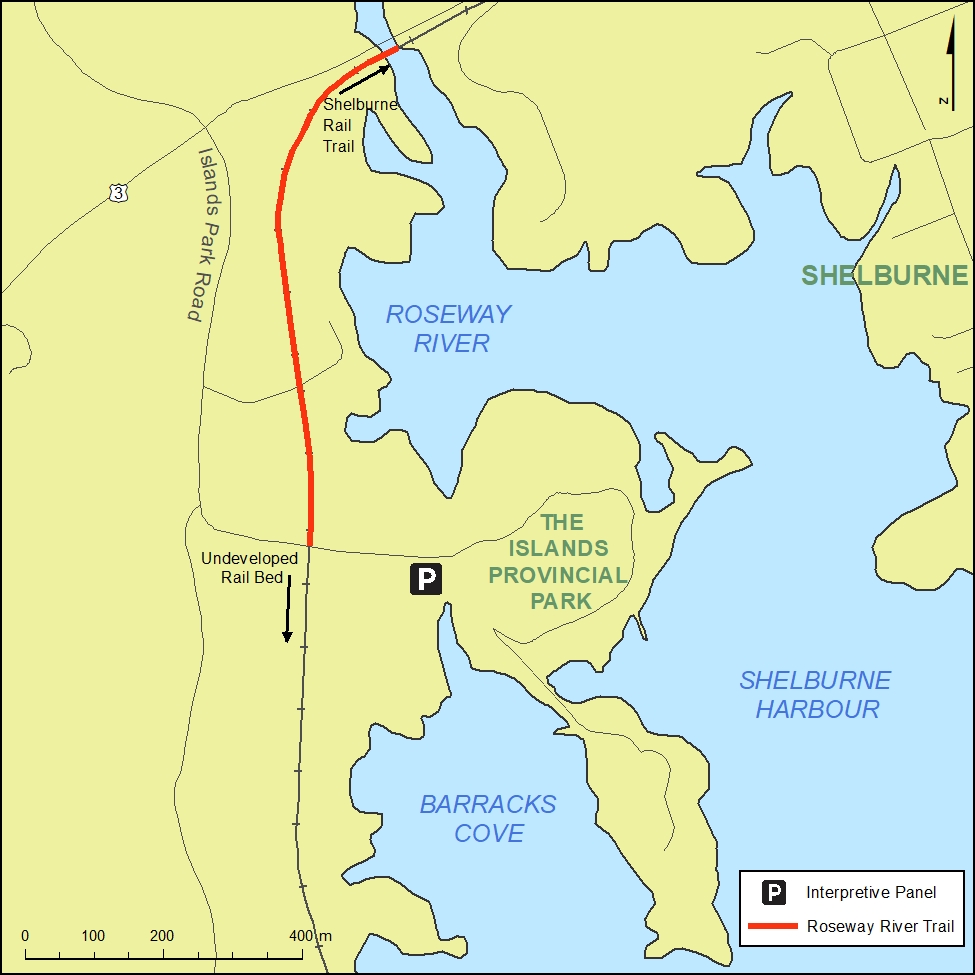The Roseway River Trail (approx. 1 km) crosses the Roseway River near Falls Lane on two small CN bridges that have a fenced board walk along them. It follows the abandoned railway bed and ends at the road near the entrance to the Islands Provincial Park. Motorized use is not allowed along the Roseway River Trail.