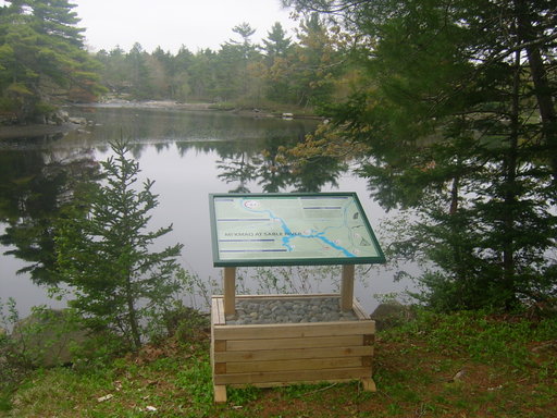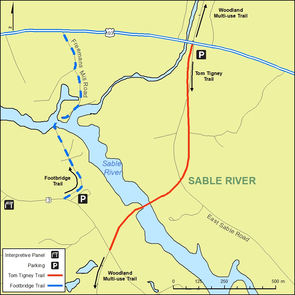 The Tom Tigney Trail (approx. 1.2 km) head is opposite the Chef’s Plate Restaurant beside the river and is a multi-use trail. A picnic table has been placed there for users to sit at and eat or take a rest to listen and watch the waters of the Tom Tigney River. The trail crosses the East Sable Road twice and about 3/4 of the way along it is a former CN bridge that now has a fenced board walk. On a warm, sunny day the view from the bridge up and down the Sable River is spectacular. This trail ends where the trail meets the old highway #3. The Tom Tigney Trail is the only trail currently approved for motorized use.